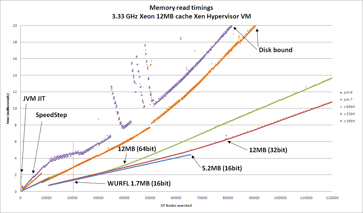 Luckily, this solution is within reach. First, the WURFL data needs to be paired down into a basic set of pattern matching rules. Then, the rule set needs to be applied to a browser's user agent string in real time. Speed and efficiency are essential here. To satisfy the speed part, I picked C as the implementation language. This is a good choice since many high performance web systems are written in C, so integration will be easy. As for efficiency, I paid careful attention to data modeling and memory access. I implemented the rule set inside of a fast search algorithm which then sits on top of a pointer compression system. This delivered unmatched performance. The final result is a device detection API which can quickly and accurately classify a device with little to no measurable CPU or memory overhead.